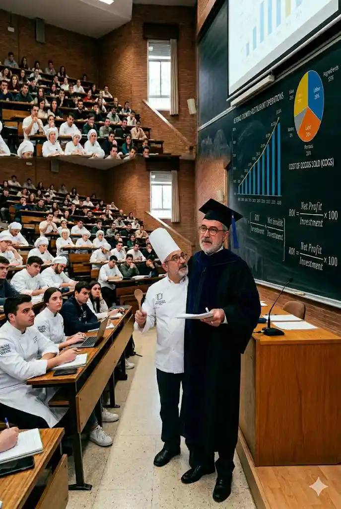De dónde nace, se crea y se trata de convencer a todo dios de que para ser cocinero-restaurador necesitas una formación integral 360 en economía, empresariales, relaciones públicas e internacionales, tecnología, física y química, geografía e historia, agricultura y pesca, etc. etc. y -¡ah! casi se me olvida- cocina ¿No se trata de un puro negocio de otros terceros pertenecientes a la industria de la formación y enseñanza y sus intereses propios, los que están detrás de todo ello?